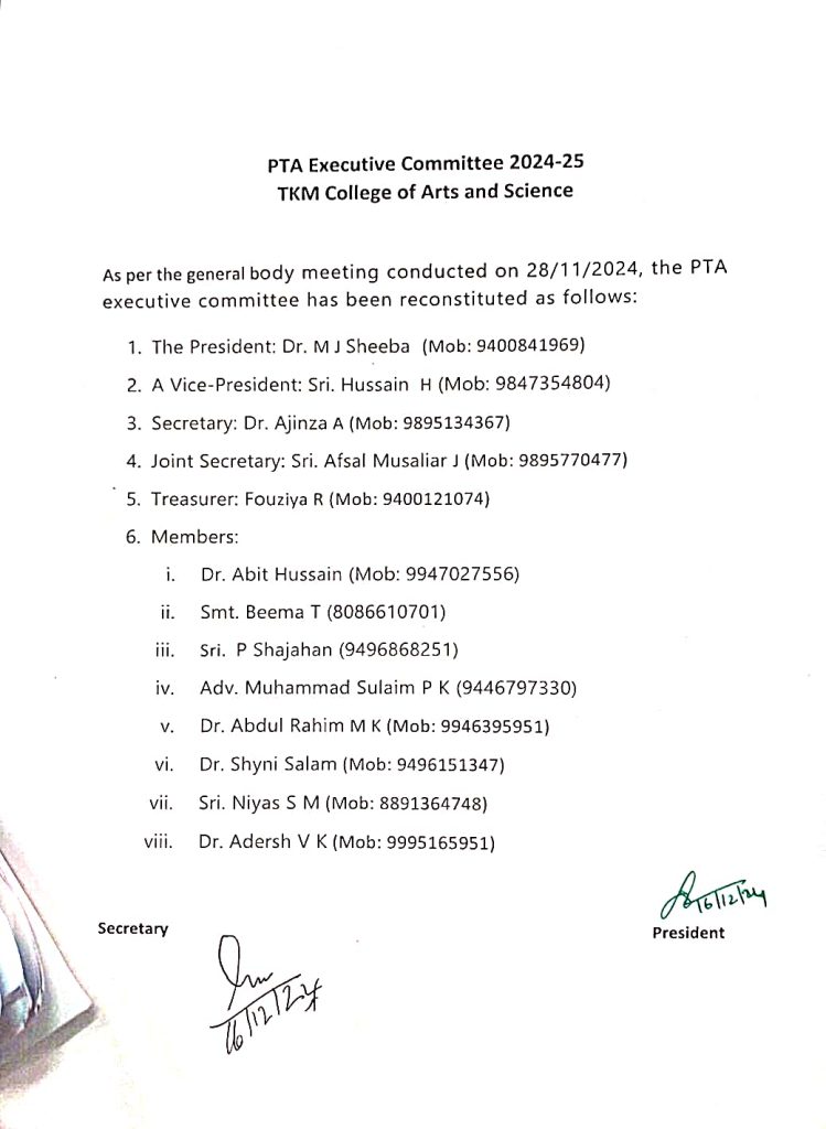 The first general body meeting is held at the commencement of the academic year and the members of the executive committee are selected in this meeting. In addition to the general body meeting Class PTA meeting are also organised to discuss the progression of the student and other allied student affairs.